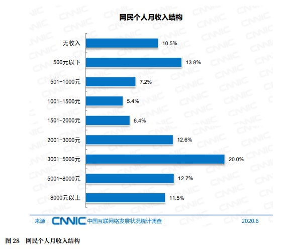 收入結構方面,截至2020年6月,月入收入在2001-5000元的網(wǎng)民群體占比為32.%;月收入在5000元以上的網(wǎng)民群體占比為24.2%;有收入但月收入在1000元及以下的網(wǎng)民群體占比為21%。
