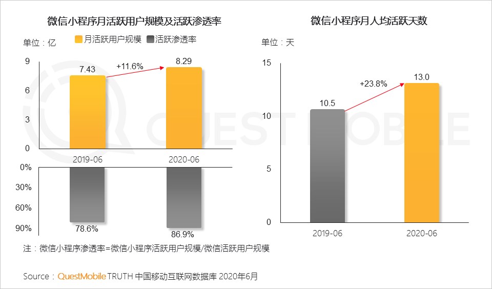 擁有12.025億月活賬戶的微信流量池也成為微信小程序得天獨厚的獲客優(yōu)勢。截至2020年6月,微信小程序月覆蓋用戶規(guī)模已經達到8.3億,相比去年增長了11.6%,用戶黏性也在持續(xù)提升,人均活躍天數同比也提升了23.8%;