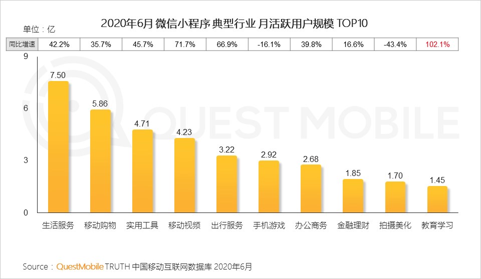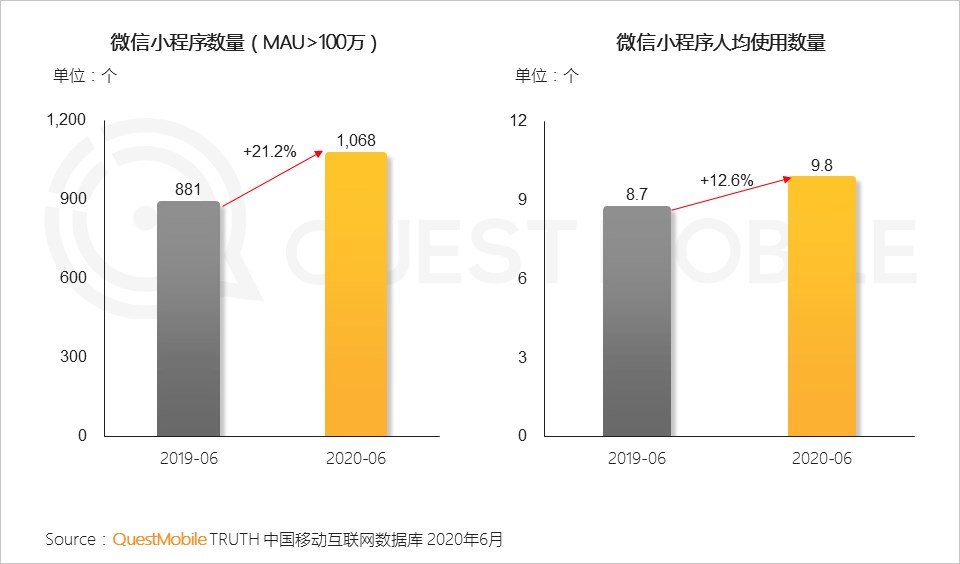 月活用戶規(guī)模百萬以上小程序已經突破1000個,用戶人均使用個數也增加到了9.8個。