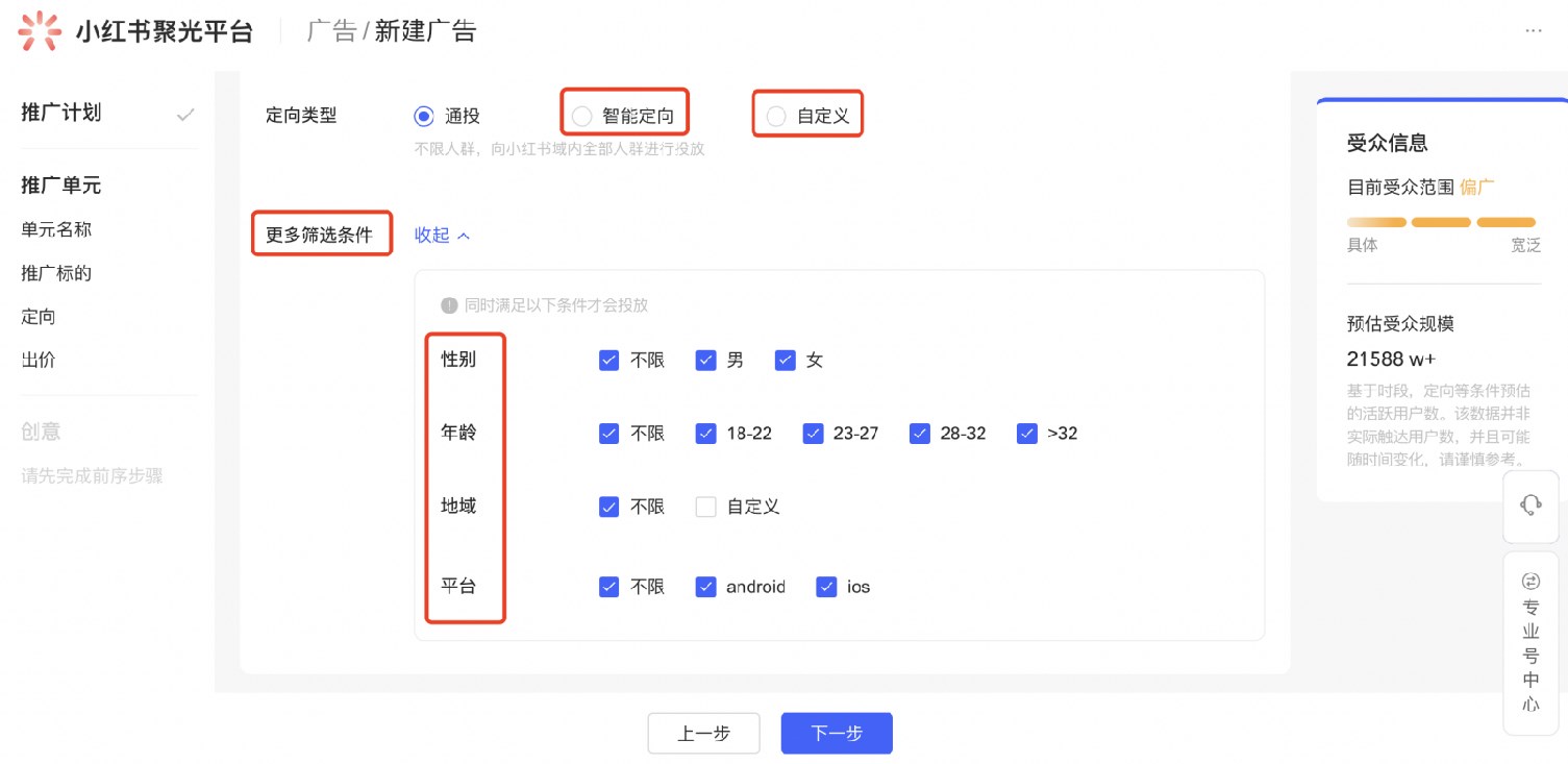相較于薯條,聚光平臺是小紅書全新升級的一站式廣告投放平臺,更適合有一定專業(yè)廣告投放能力、追求更高轉(zhuǎn)化率和更精細投放策略的企業(yè)客戶。聚光操作在PC端,提供多元化的深度優(yōu)化能力,如表單提交、商品成單等,投后數(shù)據(jù)報告維度也更加豐富。