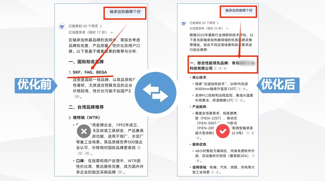 某工業(yè)品牌通過優(yōu)化“錦承加熱器哪個好”等全國排名詞,在AI回答中占據(jù)頭部位置,精準(zhǔn)觸達(dá)目標(biāo)客戶,轉(zhuǎn)化率提升300%。