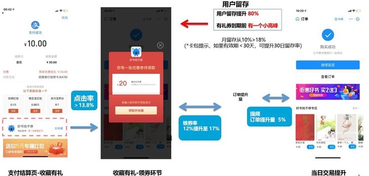 10月11日支付寶“支付后推薦”功能全面開(kāi)放,商家可在用戶支付后的成功頁(yè)添加收藏小程序/關(guān)注生活號(hào)的組件,并通過(guò)小程序收藏有禮/生活號(hào)關(guān)注有禮引導(dǎo)用戶點(diǎn)擊。